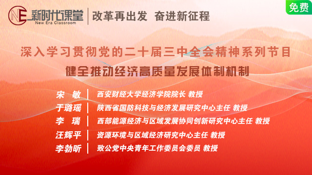 《新时代课堂》之“改革再出发 奋进新征程”—深入学习贯彻党的二十届三中全会精神系列节目,特邀西安财经大学经济学院院长、教授宋敏;陕西省国防科技与经济发展研究中心主任、教授于璐瑶;西部能源经济与区域发展协同创新研究中心主任、教授李瑞;资源环境与区域经济研究中心主任、教授汪辉平;致公党中央青年工作委员会委员、教授李勃昕,为大家讲解《健全推动经济高质量发展体制机制》敬请收看!